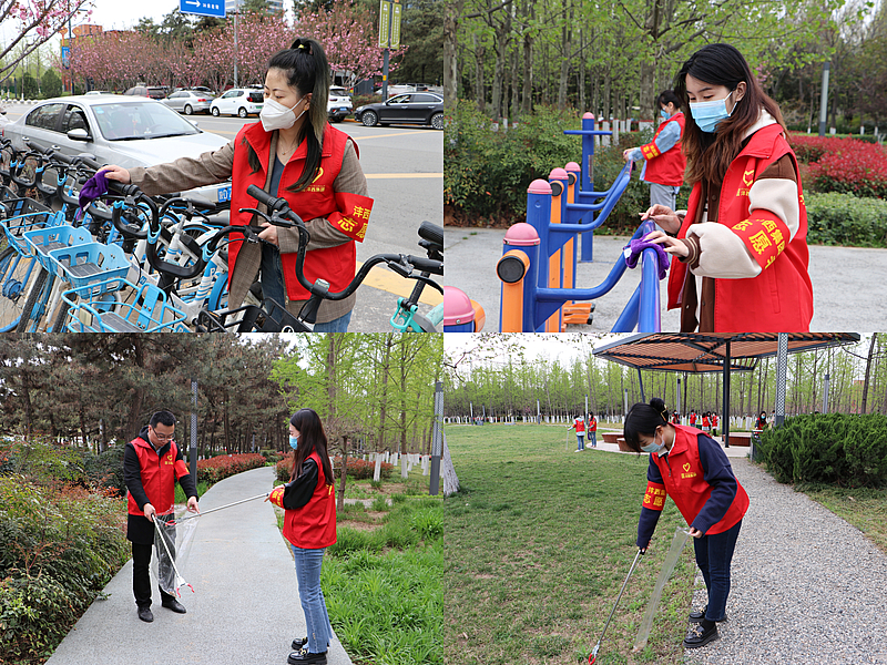 志愿者們身著紅馬甲,帶著抹布、水桶、垃圾夾等工具,分成兩隊,分區域對公園衛生進行大掃除。在公園步道,大家一絲不茍地撿拾著道路旁、草叢中的紙屑、塑料袋和煙頭等生活垃圾,對公園座椅和花壇上的塵土進行擦拭,營造整潔環保的公園環境;在健身器材區域,志愿者們用抹布一遍又一遍地對走步機、爬梯和雙杠等器材進行清理,讓群眾使用起來更加便利;在人行道上,志愿者們將隨意停放在路邊的共享單車進行統一整理,逐一搬至規定的停放區域,做文明的騎行者、停放者和宣傳者,營造綠色文明出行環境。