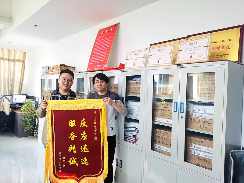 2020年8月,為配合翱翔小鎮項目建設,灃西集團主動履行服務職責,及時了解企業需求,多次前往現場實地考察,采用一路一方案的方式為企業提供定制化服務,先后建成了翱翔一路、翱翔二路、翱翔三路、翱翔四路、鯤鵬路、天元路等9條市政配套道路,為翱翔小鎮的發展提供了高效暖心的服務。優質的服務得到了企業充分肯定,2021年2月,翱翔小鎮項目送來一面寫有“反應迅速服務精誠”的錦旗,對灃西集團提供的高效服務表示感謝。