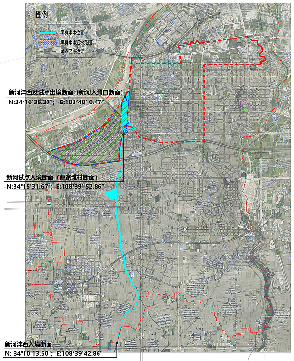 由于新河及其支流河道沿途村莊、企業較多,生活污水、企業及畜禽養殖廢水大量直排,河底淤泥堆積、水流較緩,加之水體自凈能力差,引發黑臭。2016年監測顯示,新河整體表觀質量較差,進入西咸新區灃西新城前已明顯黑臭,主要超標指標為透明度、氨氮、ORP,等級為輕度黑臭。