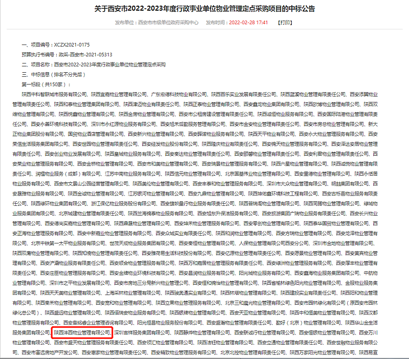 近日,陜西省政府采購網發布《關于西安市2022-2023年度行政事業單位物業管理定點采購項目的中標公告》,灃西集團物業公司成功入圍西安市定點采購協議供應商名錄,意味著日后物業公司能夠參與競標西安市行政事業單位物業服務,標志著物業公司向西安市物業服務市場邁出了第一步,為實現物業公司第二個五年戰略目標奠定了基礎。