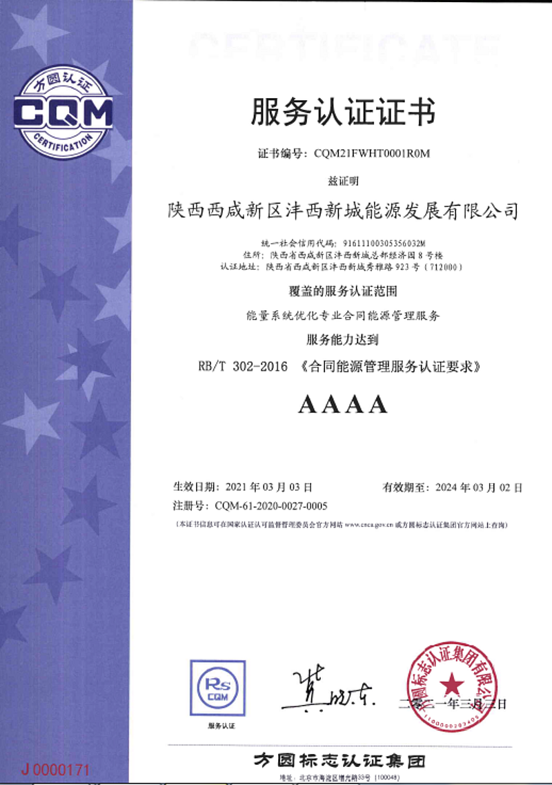 近日,能源公司順利通過方圓標志認證集團有限公司專家審核組的嚴格審核,獲得合同能源管理服務認證證書。公司以灃西新城成功的綠色能源綜合利用實例為樣本,以豐富的實踐經驗及精湛的技術為保障,為客戶提供節能環保低碳高效的綜合能源服務。節能服務產業,做大、做強、做優合同能源管理服務,為區域節能減排,為國家“碳達峰、碳中和”目標做出積極貢獻。