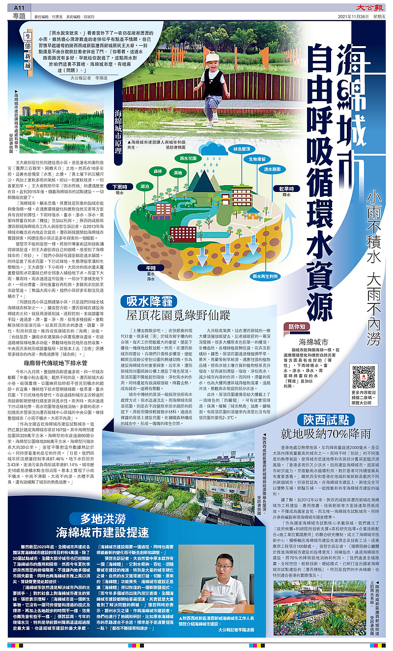 “作為國家海綿城市試點核心承載區域,我們建立了‘政府統籌+科研院所技術支撐+高校研究指導+企業技術配合+施工單位實踐應用’的聯合研究機制,成立了海綿城市技術中心,積極輸出海綿城市建設先進理念及技術工法,成果應用工程項目100余處?!睆堈芨嬖V記者,《國務院辦公廳關于推進海綿城市建設的指導意見》明確指出,通過海綿城市建設,將70%的降雨就地消納和利用?!拔覀兺ㄟ^全域推廣,全程把控,創新技術,總結模式,已經打造出國家海綿城市試點建設的‘灃西樣板’。特別是我們的中心綠廊,也特別適合香港的實際情況?!?/p>