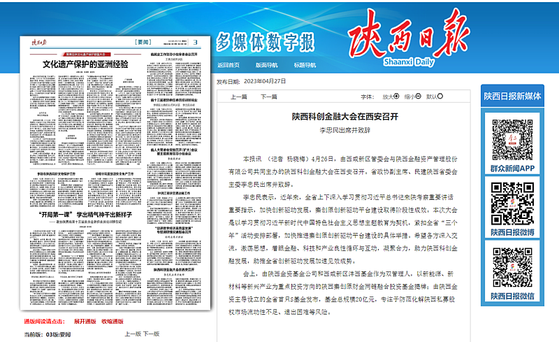4月26日,陜西科創(chuàng)金融大會在西咸會議中心舉辦。本次活動由西咸新區(qū)和陜西金融資產(chǎn)管理股份有限公司(下稱“陜西金資”)主辦,陜西金資基金管理有限公司和西咸新區(qū)灃西新城基金管理有限公司承辦,邀請政府領(lǐng)導(dǎo)、金融專家、科學(xué)家、企業(yè)家、投資機構(gòu)共同探討金融服務(wù)科創(chuàng)、助力秦創(chuàng)原發(fā)展之路,通過基金揭牌、項目簽約、金融產(chǎn)品發(fā)布等系列重磅舉措為秦創(chuàng)原科技創(chuàng)...