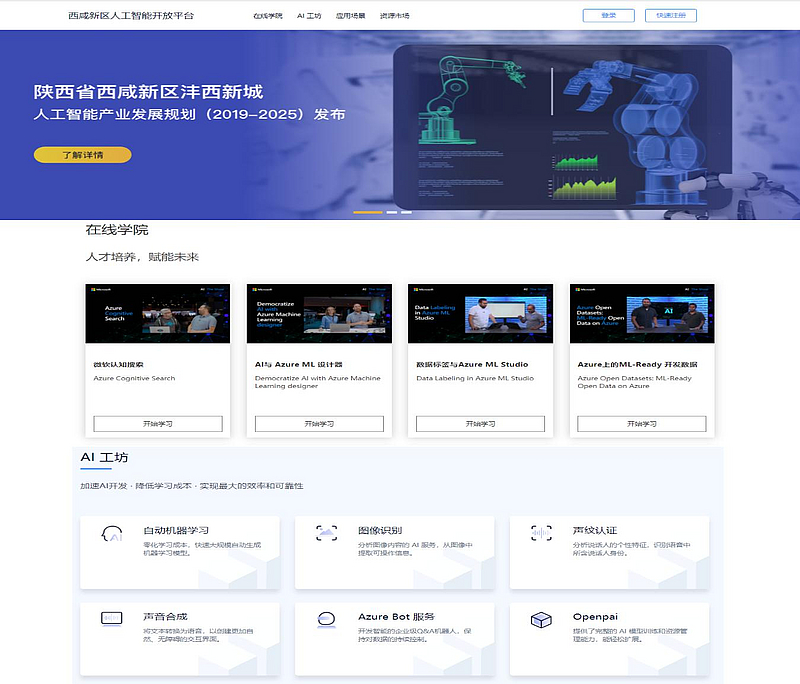 西咸新區(qū)人工智能開放平臺項目由集團(tuán)公司二級子公司陜西微軟創(chuàng)新中心有限公司于2019年1月開始進(jìn)行建設(shè),2020年9月完成上線。平臺服務(wù)于我省高校、科研機(jī)構(gòu)、開發(fā)型初創(chuàng)企業(yè)、政府、垂直領(lǐng)域各行業(yè),提供人工智能方向教學(xué)及認(rèn)證考試、技術(shù)資源、訓(xùn)練平臺和數(shù)字化轉(zhuǎn)型解決方案的綜合性平臺。項目主要包含人工智能開放平臺、人工智能學(xué)院、人工智能加速器3大版塊,涵蓋線上與線下建設(shè)內(nèi)容。